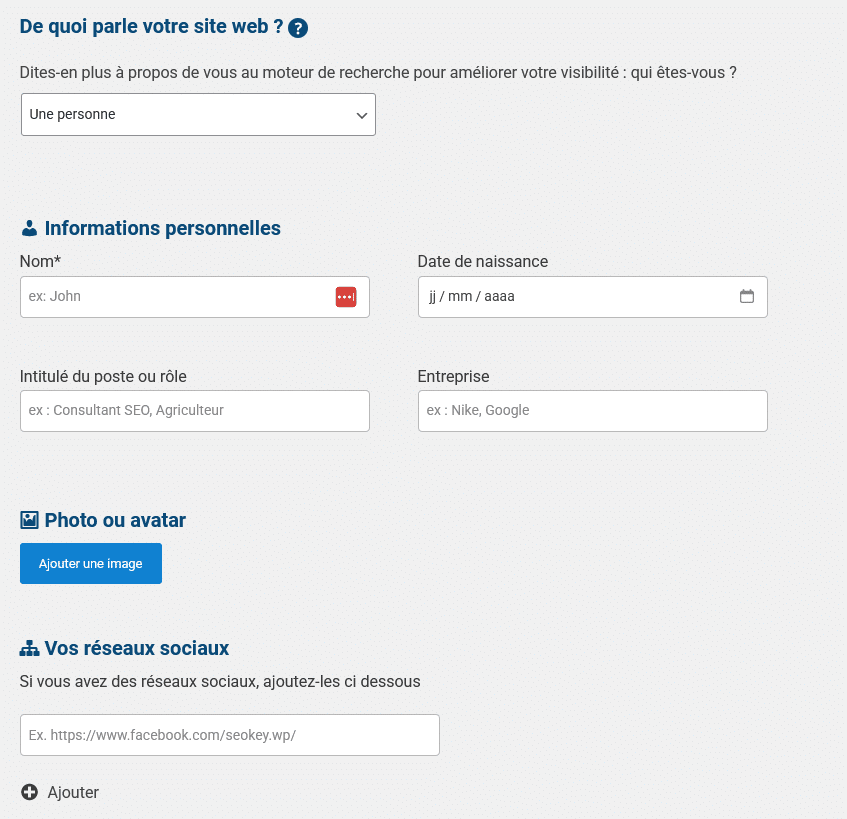 🔥 Quelle utilité en SEO ? Cela permet d’indiquer à Google et aux moteurs de recherche qui est derrière un site Internet, renforçant ainsi sa crédibilité. Techniquement, cela ajoute le balisage Schema.org pertinent sur toutes vos pages (“Person”, “Organization” ou “Local Business”).